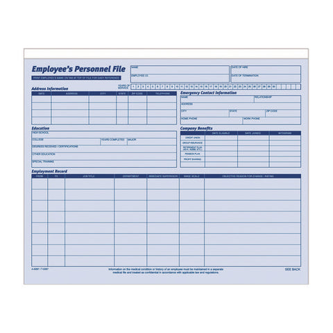 Record basic employee information with these personnel file folders. Each folder is preprinted with areas for education, company benefits and other details, while the heavy card stock material helps prevent rips and tears, so it stands up well to everyday wear and tear.