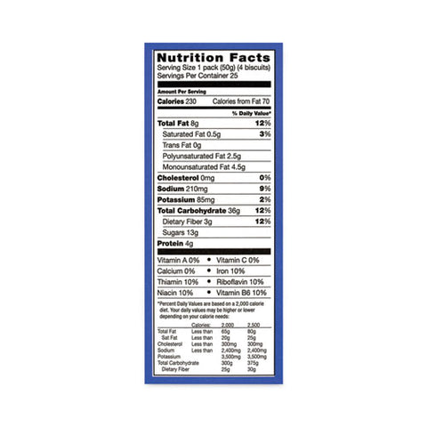 Biscuit boost! Rich, sweet and creamy nut-butter filling sandwiched between two crispy, 100% natural, whole-grain oat biscuits hits you with a surge of energy. Good source of fiber. No trans fat, no high fructose corn syrup and no artificial flavors. Individually wrapped.Note: This is a non-returnable item.