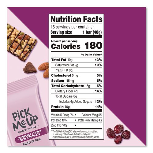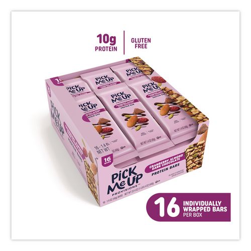 Indulge in the rich, sweet and satisfying taste of Pick Me Up Provisions™ Cranberry Almond Dark Chocolate Protein Bars! Each bar delivers a powerful 10 g of protein, fueling your busy day with incredible energy. Savor the delightful blend of crunchy almonds, tangy dried cranberries and decadent dark chocolate—these bars are not only irresistibly delicious but also gluten free. Individually wrapped for ultimate convenience, they're perfect for energizing on-the-go snacking or stocking up your breakroom!
