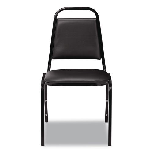 Fine seating at a fantastic price when you add the 9100 Series Vinyl Upholstered value stacker to any venue. This affordable stack chair brandishes a 1.5"-thick, pullover-style, foam-padded cushion covered with thick easy-to-clean vinyl. Plywood core within both the seat and tapered backrest which features a built-in handle for easy moving and stacking. A mighty 19-gauge square tubular steel frame includes under-seat bars to provide excellent support along with plastic glides to avoid marring floor surfaces. Eight plastic bumpers attached to protect its attractive powder-coated paint finish from scratching.