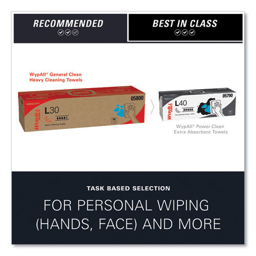 WypAll® is the number one brand of disposable wipes in the US and Canada. Create a clean work environment with light to medium duty general cleaning solutions. When you're looking for a lighter-weight towel at an everyday great price, you can trust WypAll® GeneralClean™ L30 heavy-duty cleaning towels. They are designed with the DRC (double re-creping) process, which gives you high surface softness (a towel-like feel) with a reinforced grid that's strong for wet surface wiping and cleaning. These WypAll® GeneralClean™ L30 Towels are a great choice to replace air laid towels. They're also tough enough for light-duty processing, janitorial tasks and maintenance. They're a trusted tool to help you get the job done right.