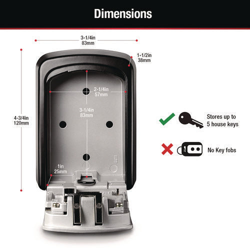 Eliminate lockouts and schedule conflicts with this key storage lock that holds more than five door, car or padlock keys. Four-dial resettable combination lock provides set-your-own combination convenience. Compartment door opens smoothly and remains attached for ease of use. Solid die-cast body withstands hammering and sawing, and zinc lock body and shutter door provide weather resistance. For children after school, cleaning or maintenance services, vacation properties and elder care providers. Includes mounting screws.
