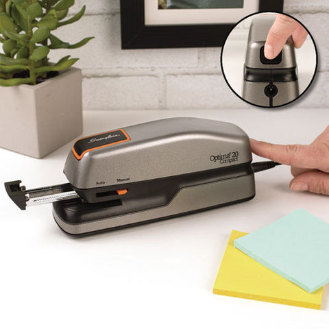Get reliable, handheld stapling with the Optima 20 Stapler.Jam Free guaranteed for fast, high-volume stapling when used with Swingline S.F.® 4® Premium or Optima Premium Staples. Staples up to 20 sheets at once. Operates quietly without compromising power or speed. Easily switch between stapling modes with the user control switch. Features...
