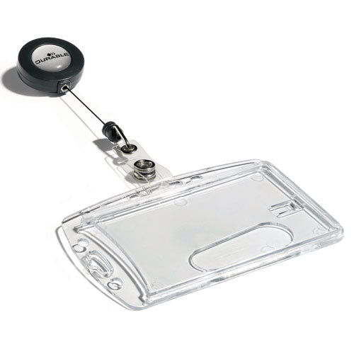 The single-card Secure Badge Holder with retractable reel from DURABLE® is designed to keep one ID card or magnetic pass secure while offering maximum convenience and protection. Ideal for schools, healthcare facilities, offices, government buildings, warehouses/manufacturing plants, banks, hotels, and conferences, this badge holder ensures that your identification is always easily accessible and secure. The retractable reel has a metal clip on the back that attaches easily to clothes (including, belts, pockets, scrubs neckline, waistline, or to your current lanyard) without causing any damage. This thoughtful design element makes the badge holder suitable for any attire, like professional office wear or work uniforms. The secure attachment ensures that your ID stays in place, even during active or busy days. Crafted from premium acrylic, the enclosed shell-style badge holder offers superior protection and durability. The high-quality material is resistant to wear and tear, ensuring that your badge holder remains in excellent condition even with frequent use. This durability is essential for environments where ID cards are handled multiple times a day, such as busy workplaces, manufacturing facilities, or large office buildings. The convenient thumb slot allows for quick and hassle-free removal of your card with a single swipe. This design enables easy one-handed scanning without the need to fully remove the card from the holder, saving time and effort in situations where swift access is needed, such as at security checkpoints or entry gates. The Secure Badge Holder can be used both vertically and horizontally, depending on your ID card layout. This flexibility ensures that no matter how your badge is designed, the holder will fit perfectly, making it a practical choice anywhere you need to keep essential cards accessible and visible.