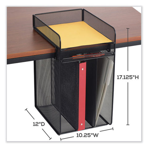 The Onyx™ horizontal hanging storage unit is a wire mesh organizer that easily attaches to a desktop and hangs below it, providing underdesk storage that saves space and time. Features one desktop tray and three underdesk trays for sorting letter-size documents, folders and files. It also has an underdesk pencil...