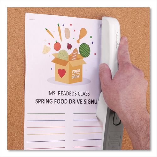 Manual desktop stapler is simple, accurate, reliable and strong. Metal construction, inner rail and positive locking latch makes this stapler especially durable, minimizes jamming and keeps staples aligned. The 747 model staples opens flat for tacking ability to post papers instantly to a bulletin board or similar tackable surface. This stapler also has a reversible anvil for pinning. By turning the anvil you can create a pin staple with legs that point out so it can be removed without a staple remover and without ripping papers.