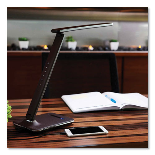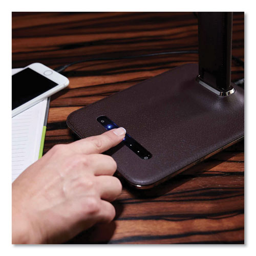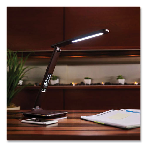 Enjoy a healthier way to see with the OttLite® ClearSun® LED, an exclusive technology that helps to dramatically reduce eyestrain and glare by up to 51%. Provides smooth, uniform light with Color Rendering Index (CRI) of 95. LCD display with date, time, ambient temperature and an alarm with battery backup to save settings in the event of power interruption. Six brightness settings, up to 400 lumens with touch activated control. Stylish faux leather texture and chrome accents. Includes 5 V, 2.1 A USB port, fully charges tablets, phones and more. Exclusive energy efficient ClearSun LEDs rated to last up to 40,000 hours.