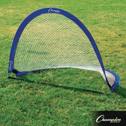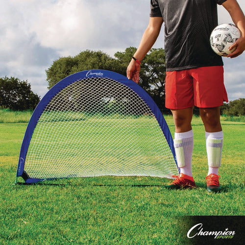 A handy, portable soccer goal, the Champion Sports pop-up half-moon goal is designed to minimize the hassle of transporting and setting up nets for practice and soccer matches. This soccer net is made with a collapsible poly/steel frame with gusseted nylon corners, nylon net and anchor pegs. It's easy to set up and tear down, as well as durable enough to last through intense outdoor play. Once you're done, the net easily folds up and goes in the included carrying case for transport and storage. Sold as a pair, you can set up a game just about anywhere. Ball not included.