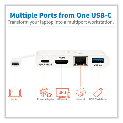 Adds HDMI, USB A, USB C PD charging and Gigabit Ethernet. Connect to USB C or Thunderbolt 3. Transmits video signals from sources supporting USB C DisplayPort Alt Mode. Delivers UHD picture quality at resolutions up to 4K x 2K @ 30 HZ. Connects to a wired Gigabit Ethernet when Wi Fi is weak or unavailable. Power Delivery port provides 20 V 3A (60W) power output for charging connected device. USB A supports USB 3.1 Gen 1 speeds up to 5 Gbps for fast data transfer.