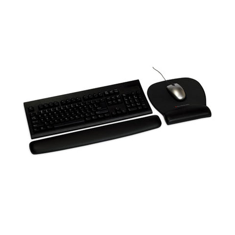 Mouse pad with foam wrist rest and nonskid base encourages neutral wrist posture. Durable fabric cover with antimicrobial product protection inhibits the growth of microorganisms, such as bacteria, that can cause stains, odors and product degradation.