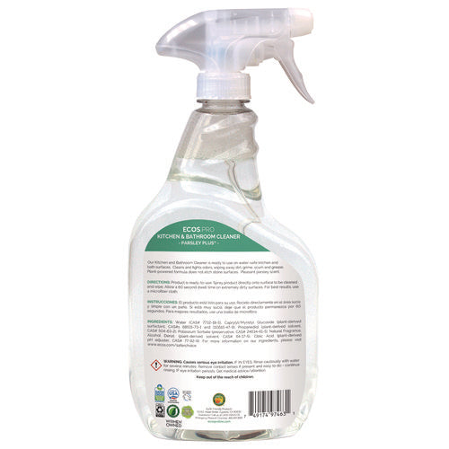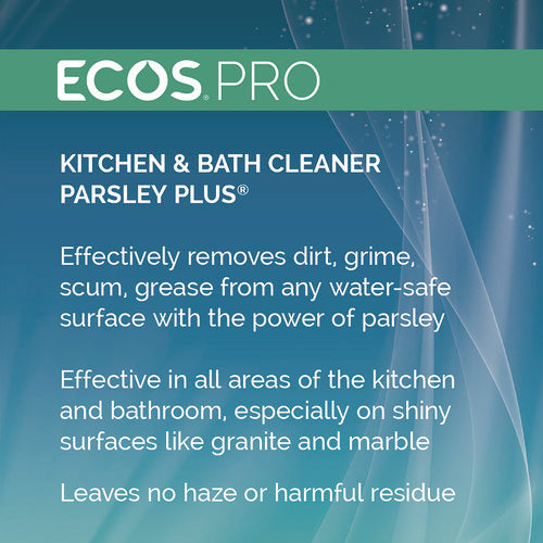 The ECOS PRO Parsley Plus all-purpose kitchen and bathroom cleaner and degreaser washes and fights odors with the natural power of parsley. This pH-balanced formula removes dirt, grease, grime, and scum from water-safe surfaces. Cleans and shines all areas of the kitchen and bathroom; works exceptionally well on granite and marble, leaving no haze or residue even on high-shine stone surfaces. Made using sustainable, plant-powered ingredients. Made without dyes; gray water and septic safe. Features a pleasant parsley scent. Not tested on animals. Manufactured in a facility that is LEED Zero Carbon, LEED Zero Waste, and LEED Zero Energy Certified.