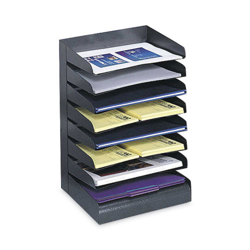 Keep everything you need within easy reach when you organize your ongoing projects and frequently referenced documents in this convenient Steel Horizontal-Tray Desktop Sorter. Sturdy, 17-gauge steel sorter features slightly back-tilted trays to ensure that documents and files remain neatly contained. Finger cut-outs on each tray's face help you access your materials when you need them. A weighted base keeps the rack standing tall, while four rubber feet protect your worksurface.