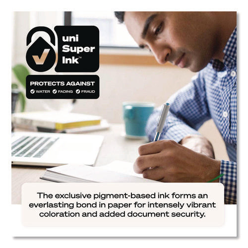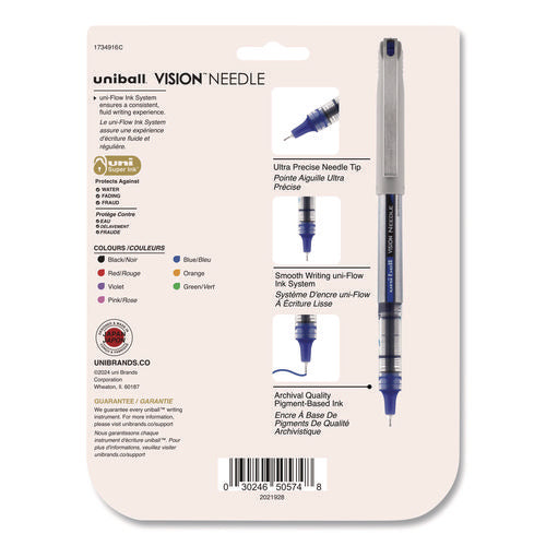 Stock your office, home or classroom with Vision Needle Stick Rollerball Pens from uni-ball featuring a strong, long lasting 0.7 mm fine point. These needle point pens are designed with a bend resistant tip for better accuracy. Even-flowing, pigment-based roller ink delivers a smooth writing experience for reliably smooth, vivid lines and a rich color for improved clarity and readability. Use these fine point rollerball pens to create perfect letters, numbers and graphics. Innovative uni Super Ink technology effectively entraps the liquid ink into the paper, producing fraud, fade and water-resistant documents that resist check washing or bleaching. The 0.7mm fine needle point allows you to create ultra-precise, straight edge lines with ease. The exclusive Uni-Flow Ink System ensures a consistent, delightfully fluid writing experience, and a translucent window ensures that you don't run out of ink unexpectedly. Enjoy beautiful clean lines and give all of your ideas a burst of brilliant color with this classic style fine point rollerball pen.
